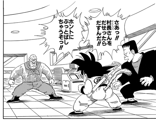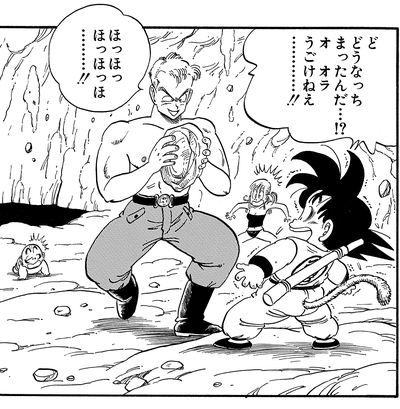 Avec Goku et ses amis ayant remporté le tournoi, Uranai Baba regarde dans sa boule de cristal pour deviner la Dragon Ball comme convenu et voit un véhicule que Goku part à la recherche. La voiture s'avère appartenir au trio Pilaf Gang , qui transportait secrètement le septième Dragon Ball. Goku se retrouve dans une bagarre avec le gang dans leur Pilaf Machine combinée, qui, connaissant la faiblesse de Goku, travaillent ensemble pour tenter de l'attraper par la queue, mais il avait déjà été cassé lors de son combat contre grand-père Gohan !