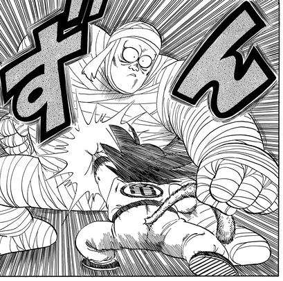 La bataille féroce entre eux fait rage d'avant en arrière sans qu'aucun des deux côtés ne cède un pouce jusqu'à ce que l'homme masqué exploite la faiblesse de Goku en l'attrapant par la queue !