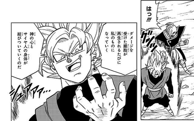 Pire encore, chaque blessure que Zamasu guérit déclenche les cellules Saiyan de Goku Black et lui donne à chaque fois une puissance spectaculaire.