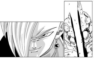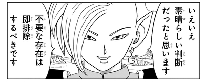 Zamasu déclare: "Si mon plan a déjà réussi à l'avenir, cela rend encore plus certain que je ne mourrai pas maintenant", puis tente de force de lancer sa méchante mission sur-le-champ, pour se retrouver rapidement détruit par Beerus.