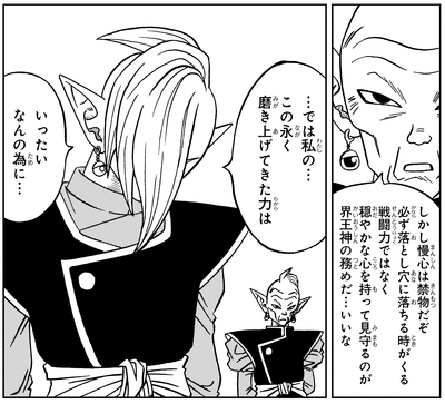 Lorsqu'on lui dit qu'un Supreme Kai doit toujours garder une âme calme et douce tout en veillant sur l'univers, Zamasu, toujours inébranlable dans sa conviction que la force doit être utilisée pour supprimer le mal, répond obstinément : "Alors pourquoi... Pourquoi ai-je passé tout ce temps et tous ces efforts pour atteindre ce pouvoir ?"