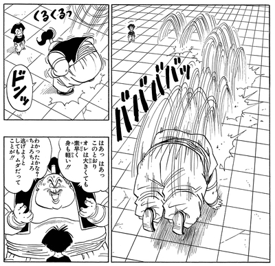 Dès le début de leur match, Punta lance des backflips fantaisistes pour intimider Krillin! Il plaisante alors : "Tu vois comme je suis rapide, même à ma taille ?!" à son adversaire peu impressionné.