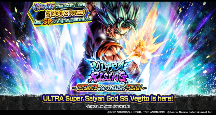 Une nouvelle invocation, "ULTRA RISING - ULTIMATE GOD-BREAKING FUSION -" est désormais disponible dans le jeu d'application à succès Dragon Ball Legends ! Il s'agit d'une invocation progressive où toutes les étapes sont des invocations consécutives 10x qui sont garanties de contenir une goutte de rareté SPARKING ou supérieure ! Certaines étapes contiennent également des avantages supplémentaires : les taux de chute des personnages ULTRA sont doublés à l'étape 2 et l'étape 4 est gratuite ! Et tout au long de l'invocation, si vous tirez le nouveau Vegito ULTRA Super Saiyan God SS (DBL61-01U), il tombera avec 2 000 Z Power !!