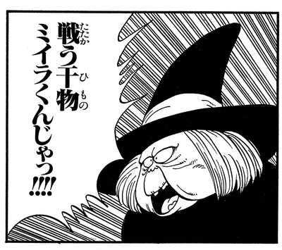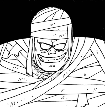 Uranai Baba présente Miira Kun à sa victime, ses « adversaires », d'une manière tout à fait unique : « Ce morceau vivant de viande séchée... la momie !!!!