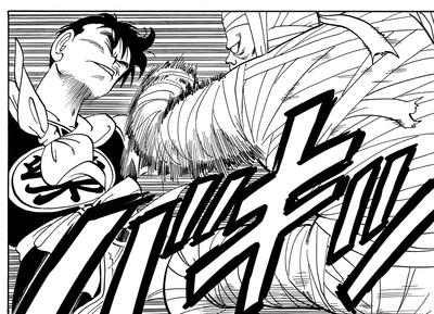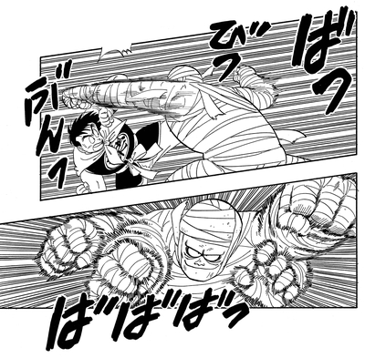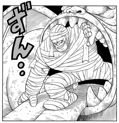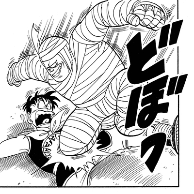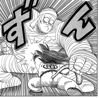 Il tire une frappe à pleine puissance sur le garçon, mais cela n'a aucun effet ! Goku répond alors avec son propre coup de poing qui pose rapidement la momie pour le décompte.