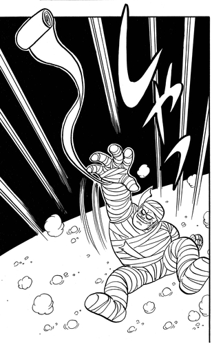 Yamcha parvient à faire trébucher Miira Kun et il semble que l'homme-momie ait fait un plongeon mortel dans l'acide... quand soudain il revient sur le champ de bataille en utilisant ses bandages !