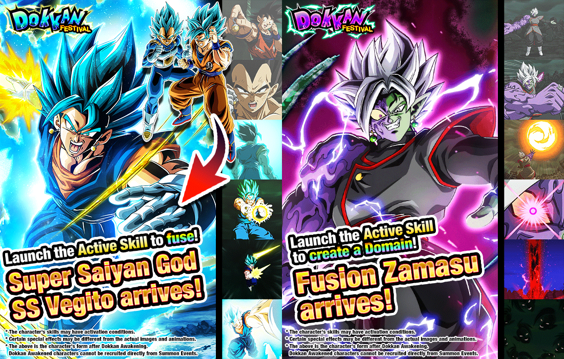 Ces deux SSR peuvent passer l’éveil Dokkan en LR pour accéder à leurs compétences actives, chacune avec des effets différents ! Super Saiyan God SS Goku et Super Saiyan God SS Vegeta peuvent fusionner en Super Saiyan God SS Vegito avec le leur, et Fusion Zamasu a la possibilité de libérer la nouvelle fonctionnalité « Domaine » ! Les deux invocations du Dual Dokkan Festival comporteront également un bonus spécial pendant les 400 premières heures suivant leur lancement : effectuez 3 multi-invocations pour obtenir 1 multi-invocation gratuite !