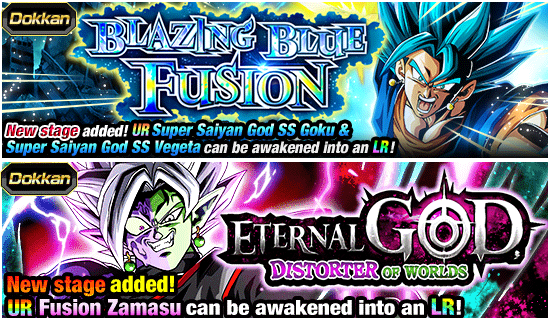 De nouvelles étapes ont été ajoutées aux événements Dokkan « Blazing Blue Fusion» et « Dieu éternel, déformateur des mondes » ! Terminez ces deux événements pour obtenir des objets pour l'éveil Dokkan, les quatre nouveaux personnages SSR disponibles dans le Dual Dokkan Festival !