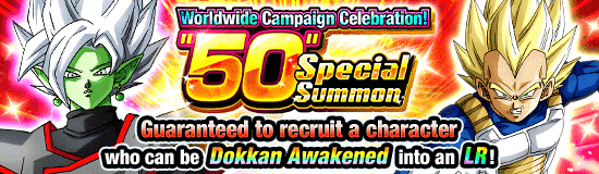 "Célébration de la campagne mondiale ! L'invocation spéciale "50" est lancée ! Vous pouvez jouer 2 versions de cette invocation : une qui utilise cinquante tickets d'invocation spéciale "50" et une qui est jouable avec 200 pierres de dragon ! Chaque version ne peut être jouée qu'une seule fois et garantit 3 personnages principaux et 1 personnage SSR qui peuvent passer l'éveil Dokkan en LR !