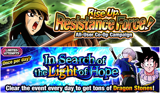 Vous ne voudrez pas non plus manquer la première partie de la campagne "Rise Up, Resistance Force! All-User Co-Op" ou "In Search of the Light of Hope", un événement à tentatives limitées auquel vous pouvez jouer une fois par jour. pour obtenir des Pierres de Dragon ! Il y a aussi l'événement d'histoire "Super Warrior Memorial [Trunks, Fighter of Hope]" où vous pouvez recruter [Facing a Mysterious Time Machine] Trunks (adolescent), ainsi qu'un autre événement à tentatives limitées, "Mettez fin à la tragédie ! Super combattants du futur Training" auquel vous pouvez jouer une fois tous les 7 jours pour obtenir des orbes de compétence EX pour vos personnages de la catégorie " Future Saga " ! Du contenu encore plus incroyable sera bientôt disponible, alors connectez-vous et participez à fond à ces événements à l'échelle véritablement mondiale !