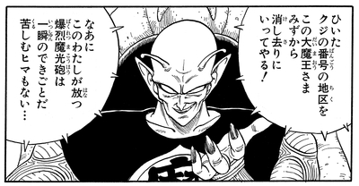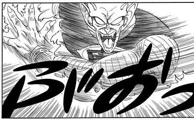 Chaque fois que le Great Demon King Piccolo utilise son pouvoir brut pour soulever quelqu'un à mains nues, nous devenons un peu faibles au niveau des genoux ! Goku, un garde du King Castle , le pilote du Mini Plane du roi, le roi lui-même et Tenshinhan, tous les cinq ont été humiliés par cette technique impitoyable. La tête de Tenshinhan s'insère parfaitement dans la main gigantesque du Grand Roi Démon Piccolo alors qu'il se balance impuissant dans les airs. Le Great Demon King Piccolo montre un mépris total pour toute menace que représente son adversaire alors qu'il abandonne la prudence en faveur d'un sourire maniaque. Cette démonstration écrasante de domination sert à illustrer à quel point cela doit être désespéré de le défier.