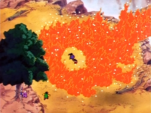 Goku utilise les fruits de son entraînement pour se frayer un chemin à travers le feu et Fan-Fan profite de la distraction pour lancer sa propre contre-attaque sur les hommes de main de Tsurusennin !