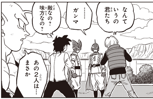 De retour à la surface, Bulma emmène Krillin, Android #18, Trunks et Goten rejoindre Piccolo et les autres. Goten et Trunks sont émerveillés par le style incroyable de ces nouveaux androïdes et tentent de devenir amis en imitant les poses de Gamma 2.