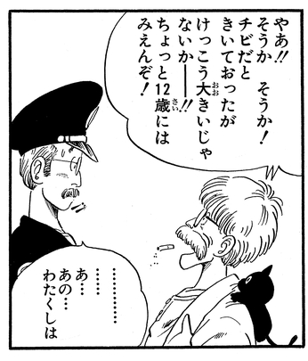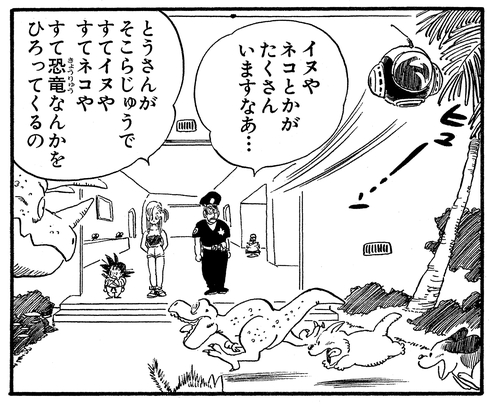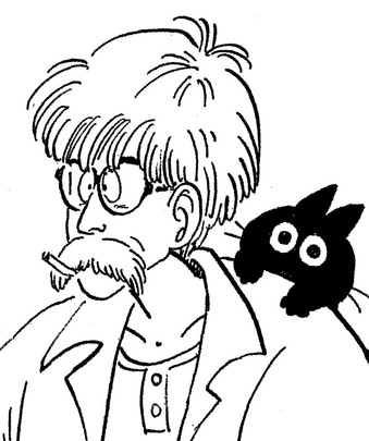 Lorsque Goku visite la Capsule Corporation pour la première fois, nous trouvons le Dr. Brief faisant du vélo dans les installations spacieuses. Ce que vous avez peut-être manqué, c'est l'adorable chat noir qui chevauchait son épaule !