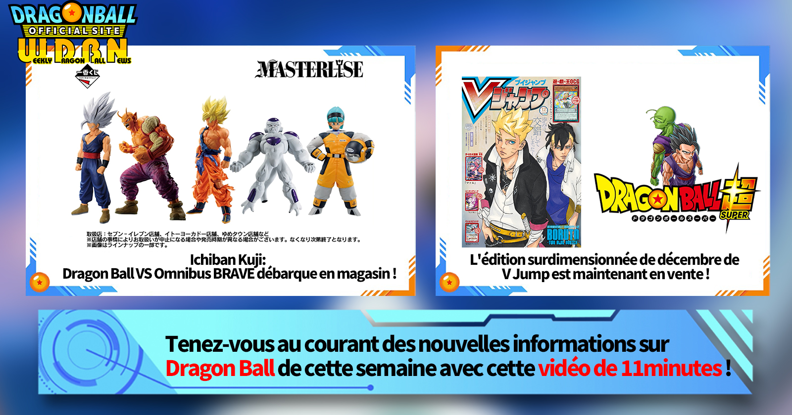 "Nouvelles hebdomadaires Dragon Ball" est une série de vidéos mise à jour tous les lundis (JST) pour vous apporter les dernières nouveautés du monde de Dragon Ball! Rejoignez Victory Uchida, rédacteur en chef de V Jump , qui couvre toutes les informations les plus récentes publiées la semaine précédente ainsi que de nouvelles mises à jour telles que des informations sur les nouveaux produits et les actualités du site pour la semaine à venir !