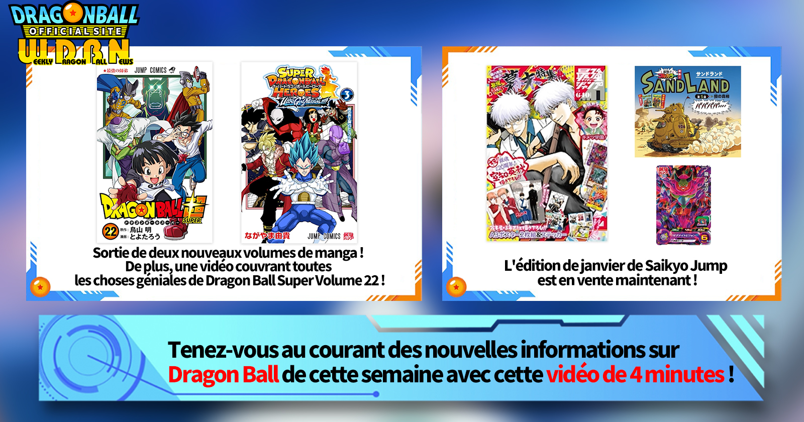 "Nouvelles hebdomadaires Dragon Ball" est une série de vidéos mise à jour tous les lundis (JST) pour vous apporter les dernières nouveautés du monde de Dragon Ball! Rejoignez Victory Uchida, rédacteur en chef de V Jump , qui couvre toutes les informations les plus récentes publiées la semaine précédente ainsi que de nouvelles mises à jour telles que des informations sur les nouveaux produits et les actualités du site pour la semaine à venir !