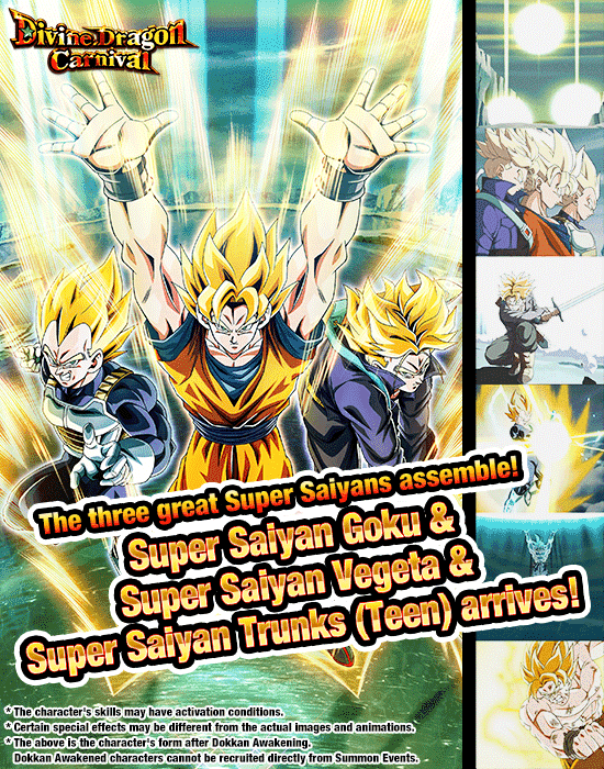 Le Carnaval du Dragon Divin est là ! Cette invocation introduit un tout nouveau personnage SSR exclusif au Carnaval, l'éveil Dokkan, dans un LR ! Cette fois, le nouveau personnage SSR est [Three Great Super Saiyans Assemble] Super Saiyan Goku & Super Saiyan Vegeta & Super Saiyan Trunks (Teen) !
