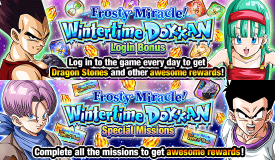 Miracle givré ! Le bonus de connexion Dokkan hivernal est activé ! Dans cet incroyable bonus de connexion, vous recevrez des récompenses fabuleuses comme l'objet au trésor « Sélectionnez un personnage Dragon Stone 2 » et le fond d'écran « Aventure dans les terres du Nord » la première fois que vous vous connecterez pendant la période de campagne !