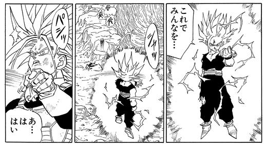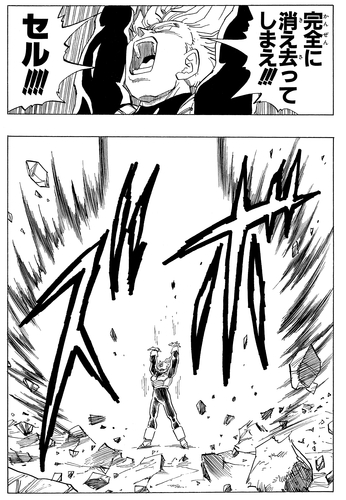 Acculé par Gohan, Cell s'autodétruit. Cependant, il est réanimé à partir de son noyau restant et tue Trunks avec une attaque soudaine et puissante.
