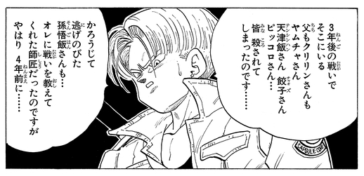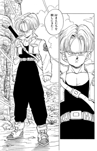 Trunks bat facilement Frieza et son père, venus sur Terre pour se venger de Goku. Une fois Goku revenu de la Planet Namek, Trunks lui dit que dans trois ans les androïdes créés par le Dr. Gero, un ancien membre de l' Red Ribbon Army, apparaîtront et tueront tous les guerriers de la Terre et que Goku succombera à une maladie. .