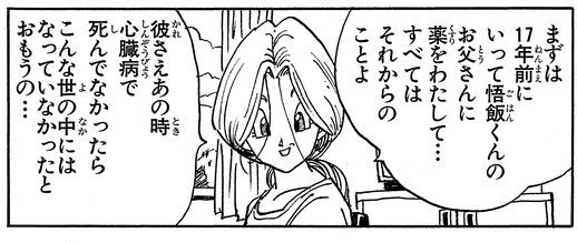 Bulma construit une machine à remonter le temps pour changer le passé en raison de sa ferme conviction que si Goku n'était pas mort, il aurait pu vaincre les androïdes.