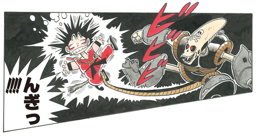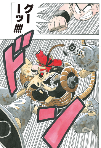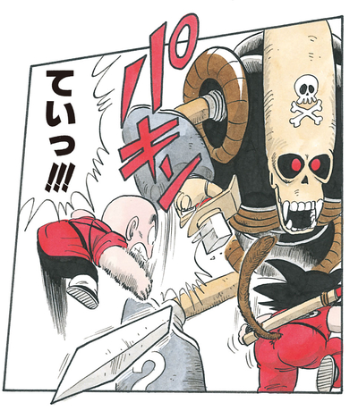 Goku saute hors de l'eau pour s'échapper et saute au sommet d'un bâtiment à l'aide de son Nyoibo. Pirate Robot le suit bientôt à la recherche de cette proie potentielle, mais est incapable de localiser le jeune Saiyan. Dans la confusion, Goku lance une attaque dévastatrice Jan-Ken (Rock) depuis les airs ! Le coup atterrit directement à l'arrière de la tête du Pirate Robot, le cassant en deux et faisant exploser le robot !!