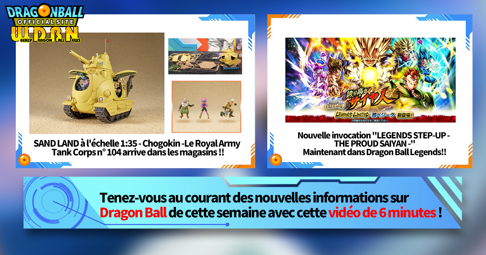 "Nouvelles hebdomadaires Dragon Ball" est une série de vidéos mise à jour tous les lundis (JST) pour vous apporter les dernières nouveautés du monde de Dragon Ball! Rejoignez Victory Uchida, rédacteur en chef de V Jump , qui couvre toutes les informations les plus récentes publiées la semaine précédente ainsi que de nouvelles mises à jour telles que des informations sur les nouveaux produits et les actualités du site pour la semaine à venir !
