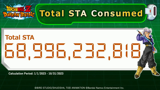 La première révélation concerne la quantité totale d'ACT (l'énergie du jeu utilisée pour jouer aux niveaux) consommée par les joueurs de Dokkan Battle, qui s'est avérée être le chiffre stupéfiant de 68 996 232 818 ! Le public a été stupéfait par cette statistique incroyable !