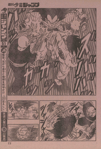 Après les pages couleur présentées dans deux chapitres consécutifs, les fans ont été encore plus enthousiasmés par le combat de Goku et Vegeta avec l'ajout de "Ultimate Warriors Unite!" carte incluse avec ce numéro.