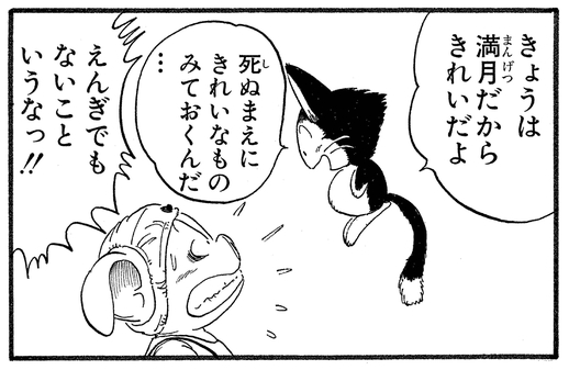 En regardant la pleine lune depuis sa cellule de prison, Puar dit : "Je veux voir quelque chose de joli avant de mourir." ce pour quoi Oolong le réprimande. Au crédit du cochon, c'est un peu lourd...