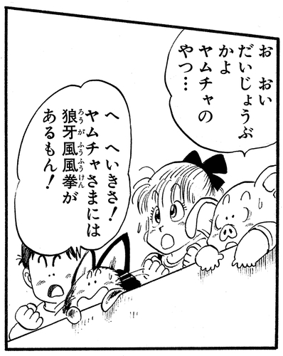 Lorsque la fille du Gyumao, Chichi , a dit à Yamcha que son visage était "certainement bizarre" à cause de sa dent manquante, Puar essaie désespérément de calmer son partenaire.