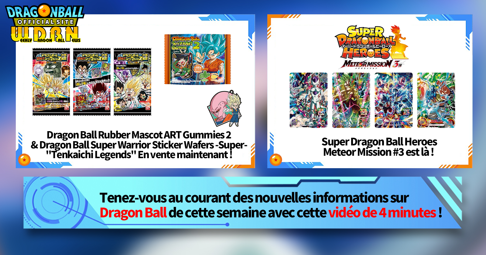 "Nouvelles hebdomadaires Dragon Ball" est une série de vidéos mise à jour tous les lundis (JST) pour vous apporter les dernières nouveautés du monde de Dragon Ball! Rejoignez Victory Uchida, rédacteur en chef de V Jump , qui couvre toutes les informations les plus récentes publiées la semaine précédente ainsi que de nouvelles mises à jour telles que des informations sur les nouveaux produits et les actualités du site pour la semaine à venir !