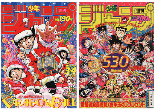 Goku continue d'apparaître sur les couvertures de Shonen Jump, comme à gauche ici où il a contribué à célébrer Noël en costume de Père Noël, ou à droite où le Saiyan est apparu au centre pour fêter les 5,3 millions d'exemplaires du magazine vendus !