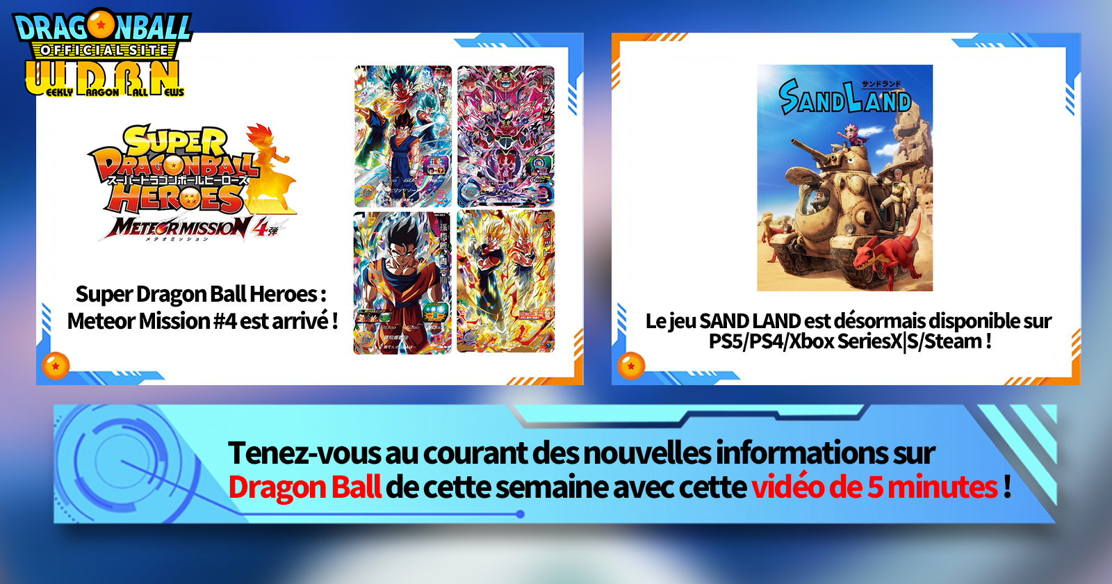 "Nouvelles hebdomadaires Dragon Ball" est une série de vidéos mise à jour tous les lundis (JST) pour vous apporter les dernières nouveautés du monde de Dragon Ball! Rejoignez Victory Uchida, rédacteur en chef de V Jump, qui couvre toutes les informations les plus récentes publiées la semaine précédente ainsi que de nouvelles mises à jour telles que des informations sur les nouveaux produits et les actualités du site pour la semaine à venir !