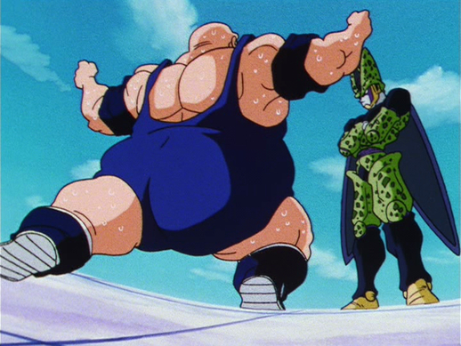 Piroshiki tente de déclencher son attaque spéciale Megaton Bull Crasher sur Cell, mais le Ki brut du bio-androïde est suffisant pour repousser le combattant musclé et l'envoyer voler hors des limites comme un chignon dans un ouragan !