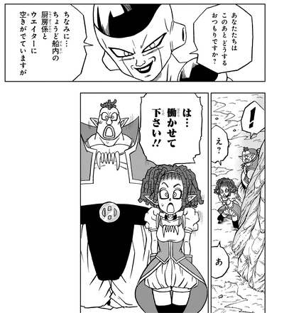 Enfin, grâce aux bonnes grâces de Freezer, Oil et Macki se retrouvent avec un nouvel emploi en tant que personnel de cuisine sur le navire de Freezer.
