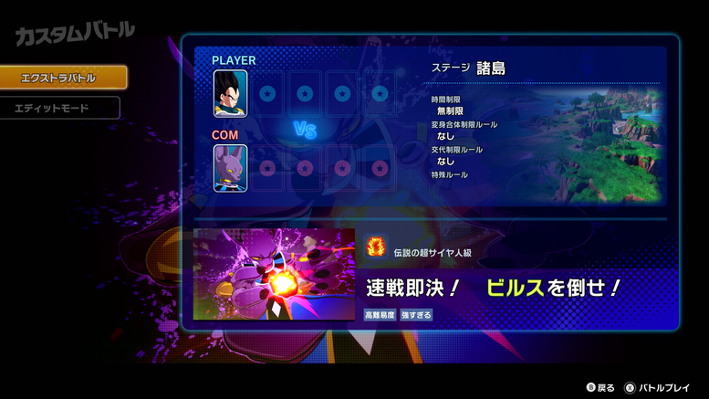 Dans "Extra Battle" auquel j'ai joué, j'incarnais Vegeta et je devais me battre pour empêcher Beerus de s'ennuyer ! Dans cette bataille, si vous n'infligez pas 20% de dégâts à Beerus toutes les 30 secondes, le God of Destruction vous avertira qu'il commence à s'ennuyer. Ensuite, si vous n'infligez pas de dégâts pendant encore 10 secondes, Beerus déclarera qu'il s'ennuie trop pour continuer la bataille et fera en sorte que la bataille se termine par un coup ultra puissant ! Cette bataille était super difficile !