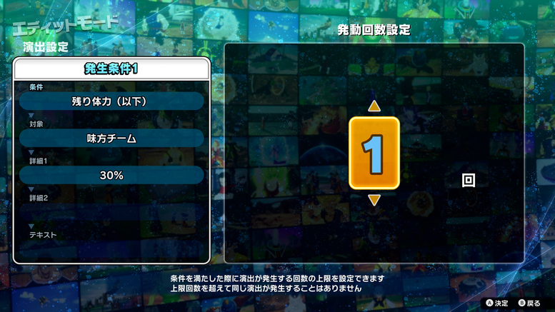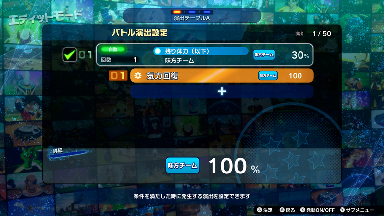 Vous pouvez configurer les personnages, l'environnement de combat et même les choses qui se produisent lorsque certaines conditions sont remplies ! Comme vous pouvez le voir sur les photos ci-dessous, lorsque la santé restante de l'équipe alliée tombe en dessous de 30 %, son Ki atteindra 100 % !