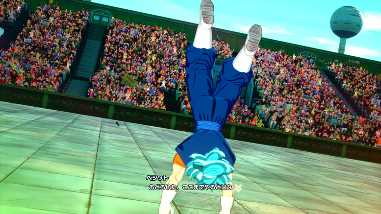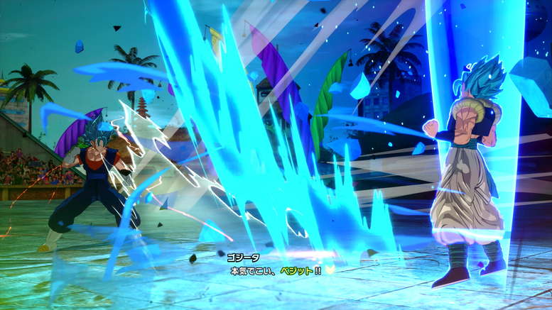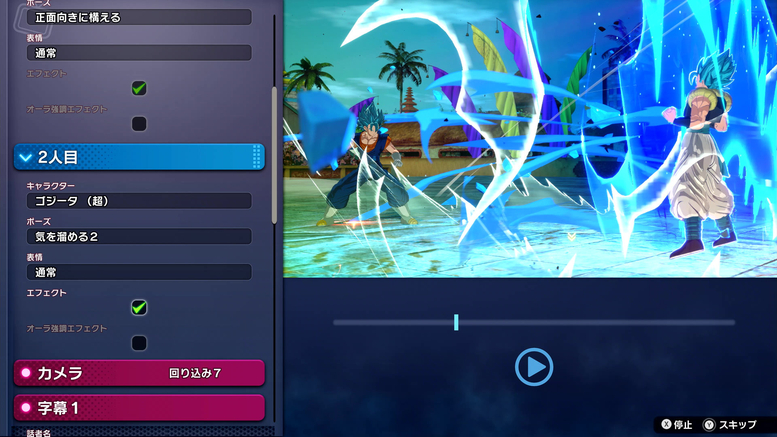 Ici, vous pouvez configurer le travail de caméra, les poses et les expressions utilisées lorsque les personnages entrent dans l'arène. Dans la scène montrée ici, Vegito a fait un backflip pour prendre de la distance et est maintenant prêt, tandis que Gogeta rassemble Ki pour le provoquer !
