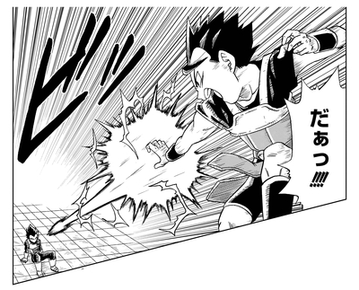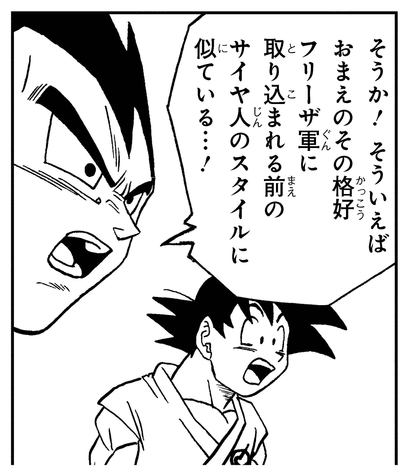 Vegeta remarque que le costume de combat de Cabba ressemble à l'armure Saiyan à l'époque pré-Frieza Force.