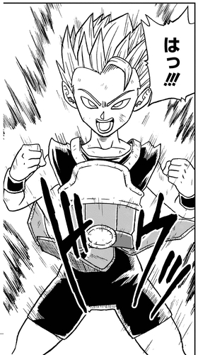 Vegeta fait sortir la rage latente du jeune guerrier en jouant le méchant et en menaçant de détruire la Planet Sadala de l' univers 6. La colère de Cabba explose en lui et à ce moment-là, il se transforme en Super Saiyan pour la première fois.