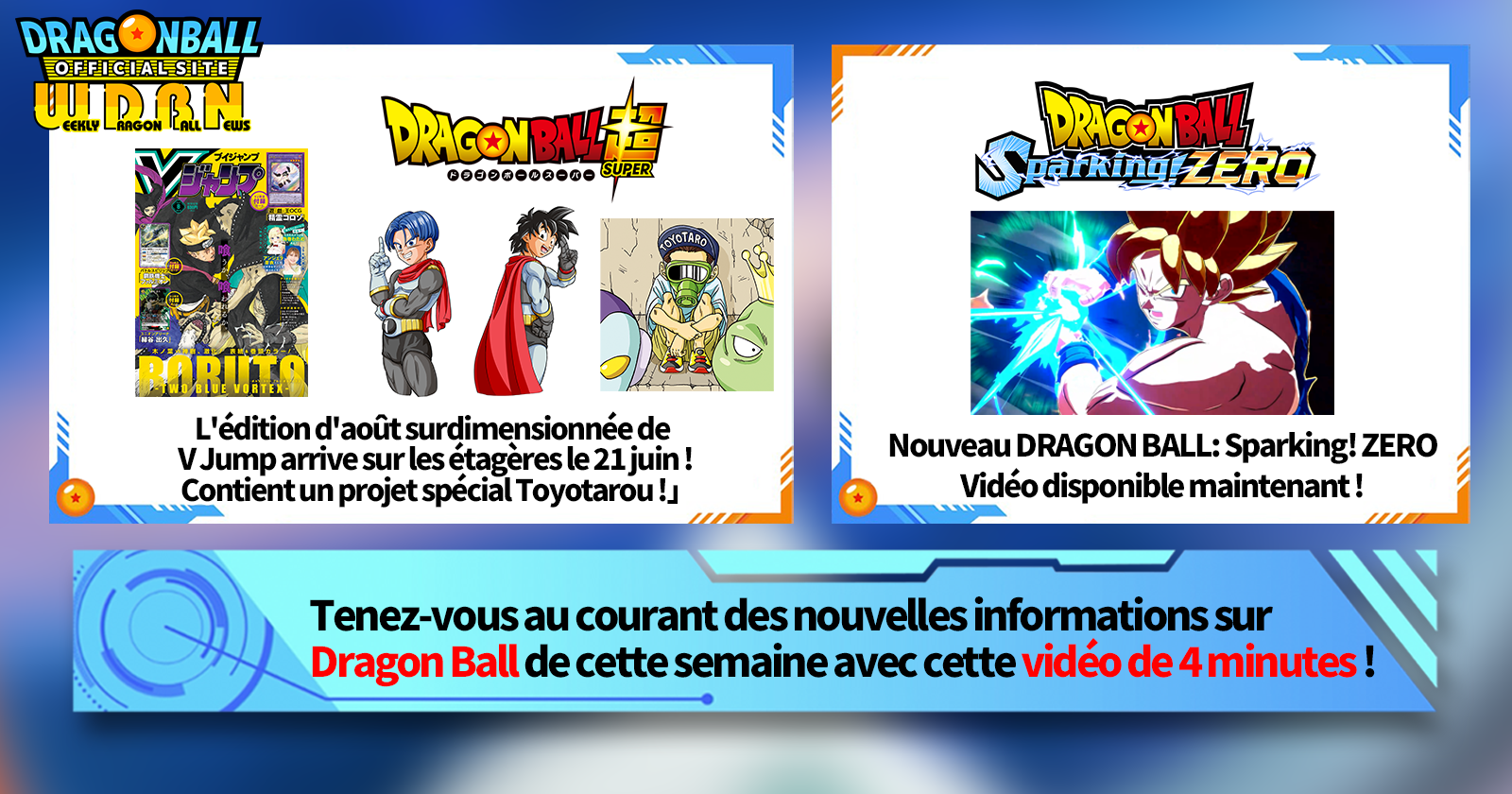 "Nouvelles hebdomadaires Dragon Ball" est une série de vidéos mise à jour tous les lundis (JST) pour vous apporter les dernières nouveautés du monde de Dragon Ball! Rejoignez Victory Uchida, rédacteur en chef de V Jump, qui couvre toutes les informations les plus récentes publiées la semaine précédente ainsi que de nouvelles mises à jour telles que des informations sur les nouveaux produits et les actualités du site pour la semaine à venir !