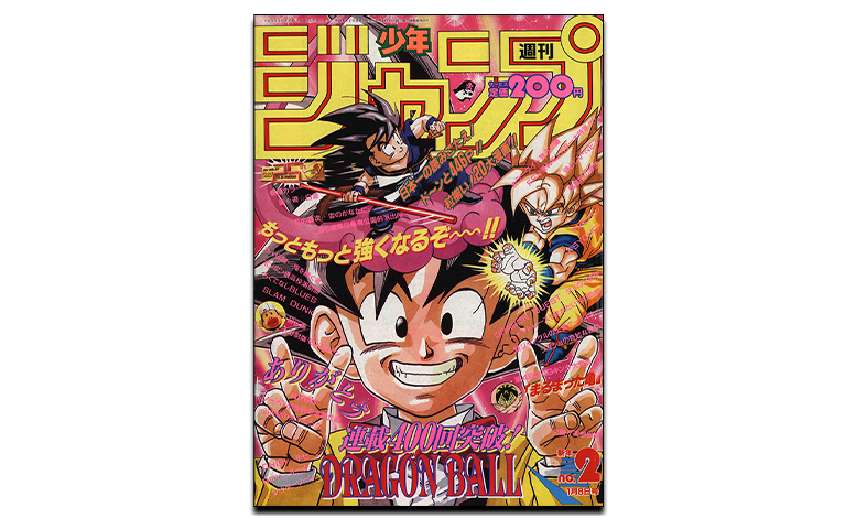 Dans le Weekly Shonen Jump 1993 n°2, la série Dragon Ball a atteint 400 sérialisations ! Sur cette couverture de célébration, un jeune Goku est représenté juste à côté de l'actuel Super Saiyan Goku, ce qui vous fait vraiment ressentir la longue histoire de la série !