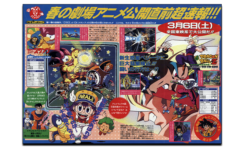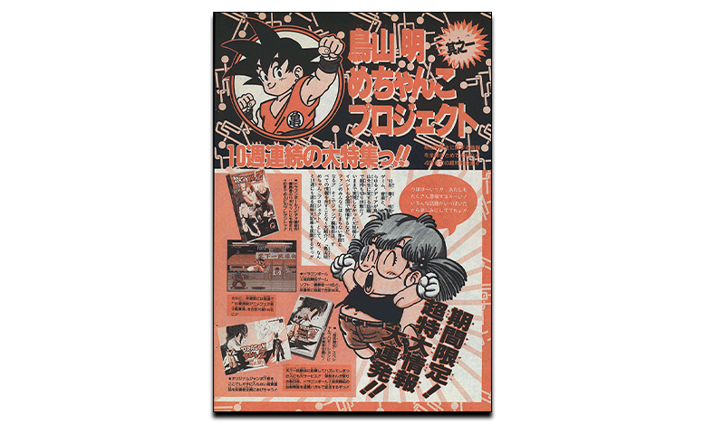 Cependant, le boom de Dragon Ball ne s’est pas limité au monde du manga et de l’anime ! À partir du Weekly Shonen Jump 1993 n°8, le « Projet Akira Toriyama Mechanko » a commencé ! Des informations sur les mangas, films, jeux et bien plus liés à Toriyama ont été présentées pendant dix semaines entières !