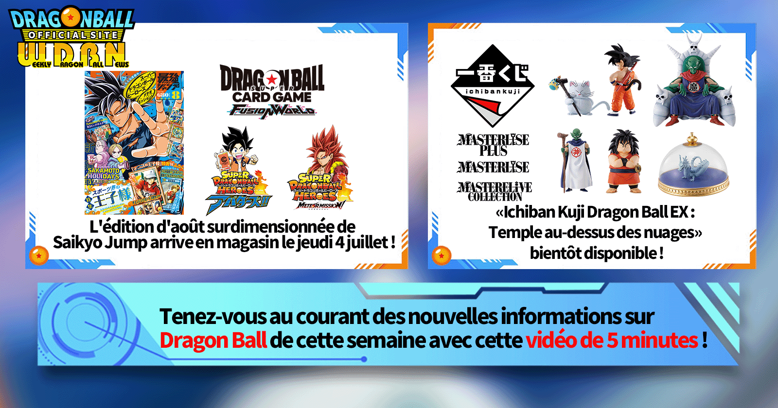 "Nouvelles hebdomadaires Dragon Ball" est une série de vidéos mise à jour tous les lundis (JST) pour vous apporter les dernières nouveautés du monde de Dragon Ball! Rejoignez Victory Uchida, rédacteur en chef de V Jump, qui couvre toutes les informations les plus récentes publiées la semaine précédente ainsi que de nouvelles mises à jour telles que des informations sur les nouveaux produits et les actualités du site pour la semaine à venir !