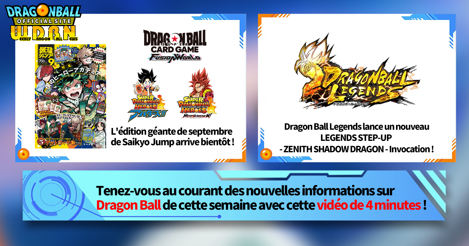 "Nouvelles hebdomadaires Dragon Ball" est une série de vidéos mise à jour tous les lundis (JST) pour vous apporter les dernières nouveautés du monde de Dragon Ball! Rejoignez Victory Uchida, rédacteur en chef de V Jump, qui couvre toutes les informations les plus récentes publiées la semaine précédente ainsi que de nouvelles mises à jour telles que des informations sur les nouveaux produits et les actualités du site pour la semaine à venir !