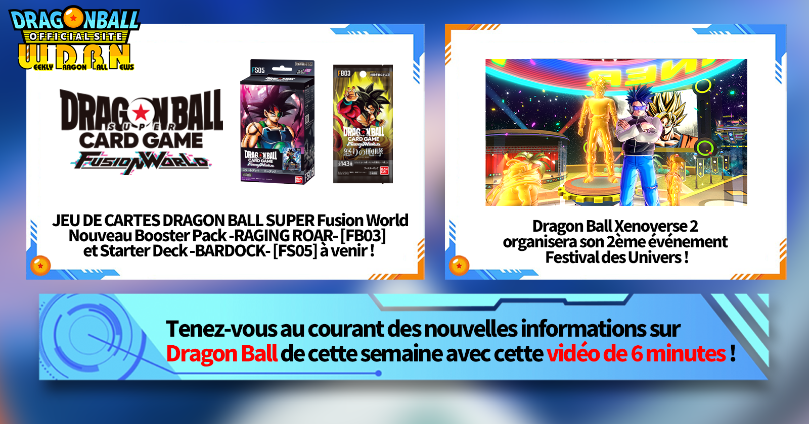"Nouvelles hebdomadaires Dragon Ball" est une série de vidéos mise à jour tous les lundis (JST) pour vous apporter les dernières nouveautés du monde de Dragon Ball! Rejoignez Victory Uchida, rédacteur en chef de V Jump, qui couvre toutes les informations les plus récentes publiées la semaine précédente ainsi que de nouvelles mises à jour telles que des informations sur les nouveaux produits et les actualités du site pour la semaine à venir !