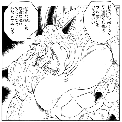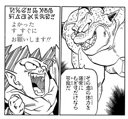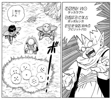 Après un affrontement féroce et acharné avec Frieza pour rassembler toutes les Dragon Balls, Krillin et Gohan parviennent à invoquer Porunga grâce à l'aide de Dende.