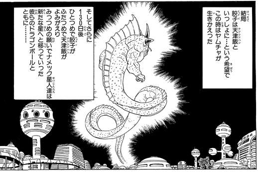 130 jours plus tard, les Dragon Balls Namekian sont à nouveau rechargées en énergie, et cette fois, les premier et deuxième vœux sont utilisés pour ramener Chaozu et Tenshinhan à la vie. Enfin, le troisième souhait est utilisé pour déplacer les survivants Namekian vers leur nouvelle planète d'origine.