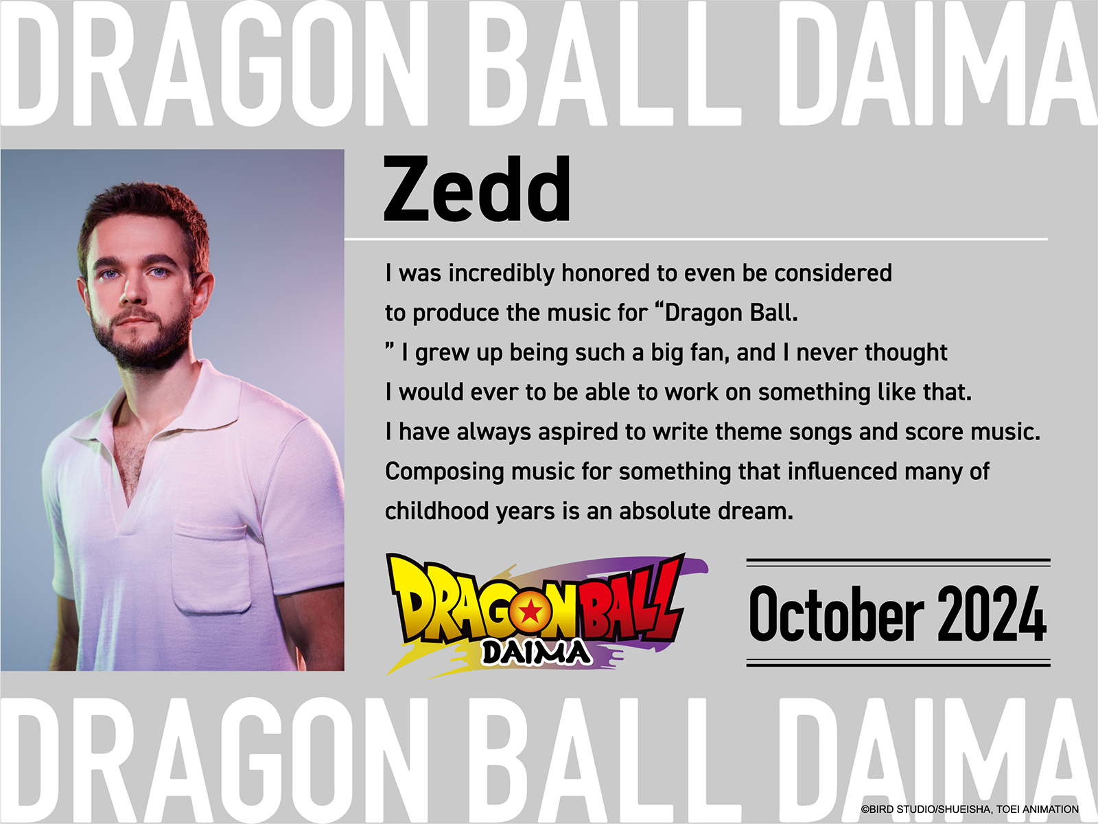 Zedd has been an outspoken fan of Dragon Ball for years and accepted the offer to create a song for Dragon Ball DAIMA. This is the first time Zedd has taken on composing the theme song for an animated work. Composing the lyrics is Yukinojo Mori, who has brought numerous great songs to the Dragon Ball world like “CHA-LA HEAD-CHA-LA” and “Limit Break x Survivor.” And in response to Zedd’s request for a main chorus you would expect of a Japanese anime, the singing and songwriting unit C&K brought their overwhelming vocals and genre-transcending musical sense to help compose and bring voices to the theme song! This song is a super collaboration that will mark a new page in Dragon Ball history!